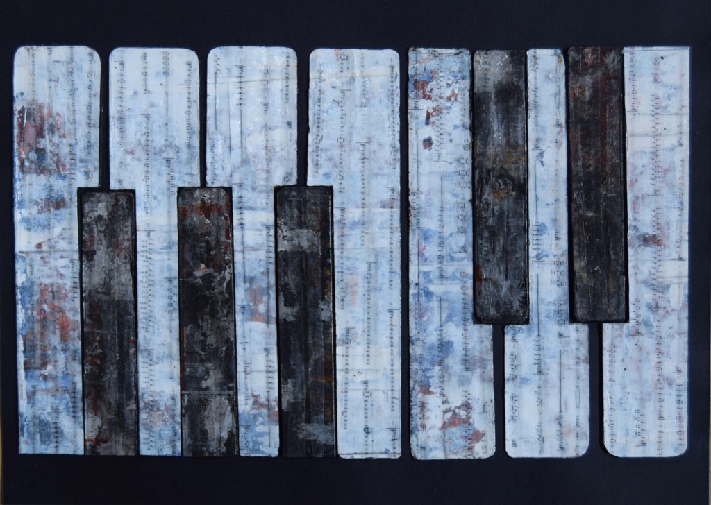 Dichotomy is echoed from the musical piece (with its 2 kinds of time: rhythmic pulse and wind/voice) by not only the obvious difference in tones (the white, cool keys against the dark, warm sharps), but also the juxtaposition of the collaged sheet music (vertical) to the layout of the keyboard (horizontal). Visually, they seem to crawl across the canvas and represent time, our most precious commodity.